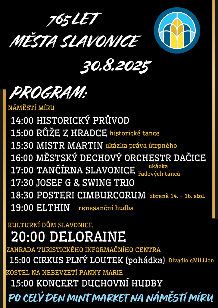 Město Slavonice vás zve na slavnosti, které se uskuteční 30. srpna 2025 na náměstí Míru a v kulturním domě. Program zahrnuje historický průvod v 14:00, následovaný ukázkami historických tanců, práva útrpného a koncerty různých hudebních uskupení. Během celého dne bude na náměstí probíhat MINT market, kde si můžete zakoupit různé produkty a užít atmosféru slavností.