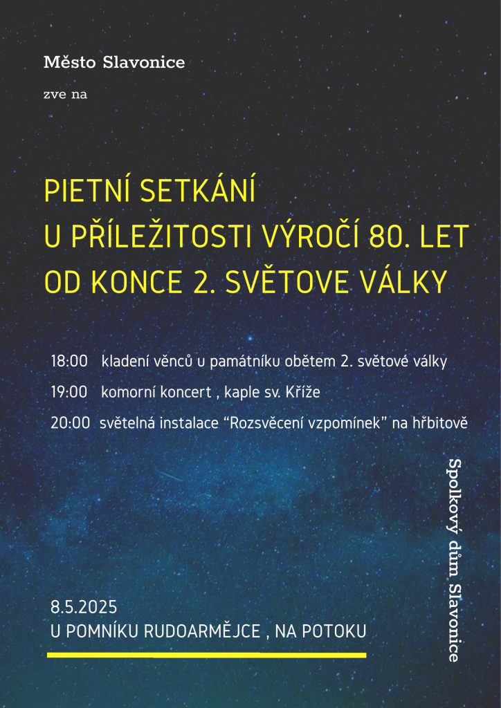 Pietní setkání se koná 8. května 2025 v Slavonicích na památníku obětem 2. světové války. Program začíná v 18:00 kladením věnců, následně v 19:00 proběhne komorní koncert v kapli sv. Kříže. Akci zakončí v 20:00 světelná instalace „Rozsvěcení vzpomínek“ na hřbitově.