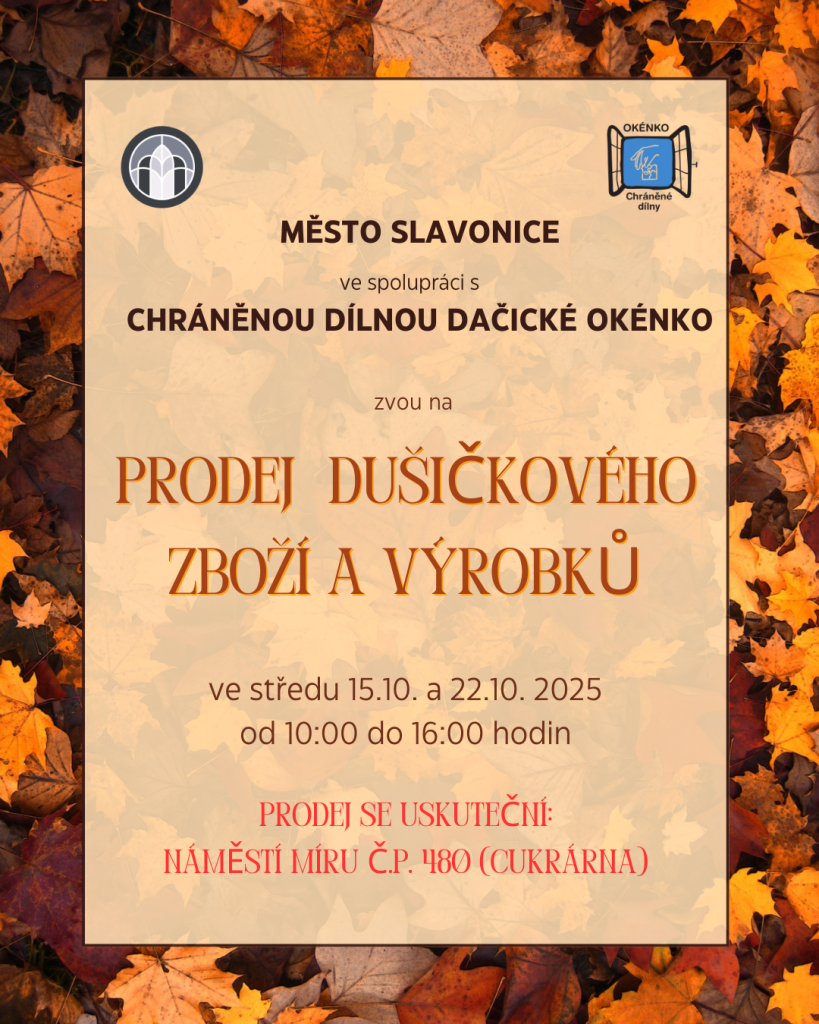 Město Slavonice a Chráněná dílna Dačické okénko vás zvou na PRODEJ DUŠIČKOVÝCH DEKORACÍ A ZBOŽÍ, který se koná ve středu 15.10., od 10:00 do 16:00 hodin.